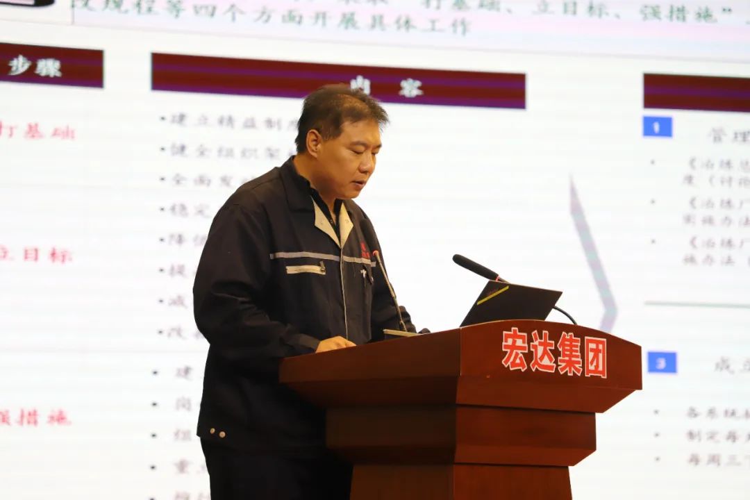 总经理刘世峰对管理提升项目工作进行了再动员再部署。随着管理提升项目逐步进入深水区,革新也从最初查缺补漏等简单精益管理工具使用到开展系统、深度地精益提升管理,这一瓶颈有待突破。下一步如何切实有效推进精益管理,刘世峰提出三点意见:一是精益管理提升是宏达公司全体人员的事情,岗位创新、精益运营大项目、现场5S管理、标准化作业、赋能培训等,无论是生产一线还是行政后勤部门,大家必须全员参与,要真正提高认识,全身心投入到这一次的管理革新行动中去。二是钢铁行业的竞争压力大,注入新的管理思维和新的运行机制是提升公司盈利能力和市场竞争力的根本手段,必须打破惯有思维、求新求变。三是公司各层级管理人员要保持戒骄戒躁,坚持空杯心态,结合自身实际,积极学习精益的理念、工具、方法,沉下心、以成本最优为主线、以管理提升为手段,调整好状态,全力以赴推进管理提升、推进降本增效。 董事长张会民在会上做了重要讲话,对精益管理提升项目进展情况及大家的工作精神、工作成效给予充分肯定,并对钢铁行业市场现状进行客观分析,对公司下一步应对思路与方法提出了明确要求。 他指出,管理提升项目开展以来,公司选派了3批次40余人的管理团队到永锋参观交流学习,大家积极主动寻找差距,采取了有针对性和富有成效的改进提升措施。面对钢铁市场的寒冬,我们要正确认识自身优势和短板,最大限度发挥优势,弥补短板。首先要建设一支高素质、高水平的精细化管理团队,带领全员精心操作,认真负责,杜绝跑冒滴漏,通过实施管理提升项目降低生产成本,提升生产效率;其次要瞄准行业前沿工艺技术,全力推进100万吨薄带铸轧项目落地实施,从根本上进行绿色转型,提升产品档次,通过延链补链强链强力推进企业高质量持续发展,建设中西部乃至全国领先的精品钢生产基地;第三对现有部分轧线进行技术改造,在建筑用材版块进一步丰富产品规格,完善产品结构,争取宏达产品在全国棒线材市场中占有绝对优势,同时要最大程度发挥LF精炼炉的优势,增加品种钢生产占比,争取更多市场份额。 大会号召全体员工,在大浪淘沙的残酷市场环境中始终保持锐意进取、求真务实、担当作为的精神状态,满怀信心、持续深入推进精益管理,更好提升盈利能力、降低工序成本,从而奠定更加坚实的持续健康发展基石,推动宏达集团永续发展、再创辉煌。